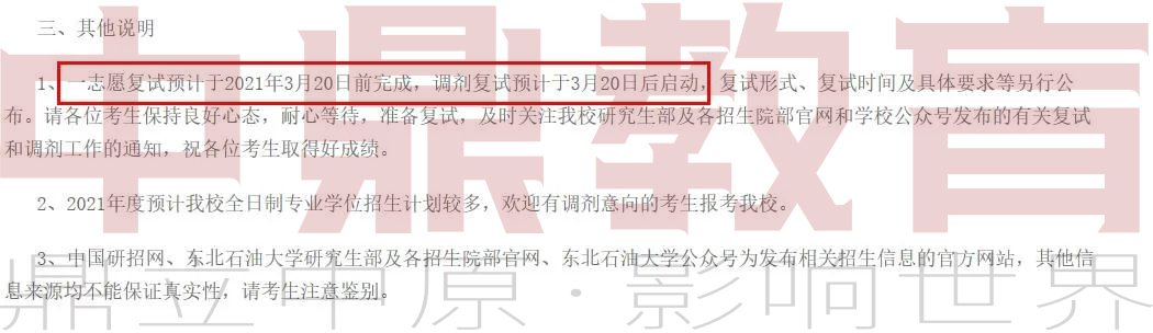 东北石油大学通知称,一志愿复试预计于2021年3月20日前完成,调剂复试预计于3月20日后启动,复试形式、复试时间及具体要求等另行公布。