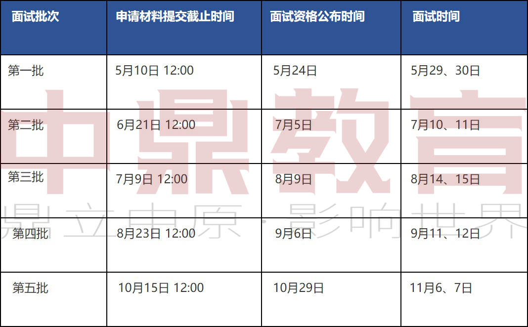 ②填写和上传申请材料。网上提交的申请材料包括:申请书、成绩单、个人简历、收入证明、单位组织结构图,推荐信(非必需)。申请材料的具体内容和要求见系统内说明。考生提交申请材料时需要选择申请面试批次,并在所选批次申请材料提交截止日期前提交。各批次的申请截止时间、面试资格公布时间和面试时间见下方"面试批次"表。