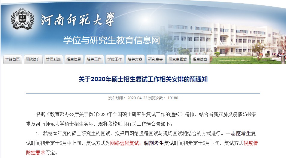 近日,郑州大学研究生院发布通知:复试方式原则上采用网络远程复试方式进行,复试时间不早于5月10日。
