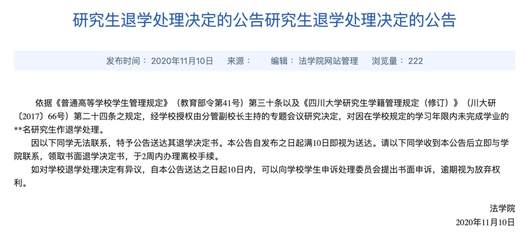 11月10日,四川大学法学院官网公布了一份《研究生退学处理决定的公告》。公告称,依据规定,经学校授权由分管副校长主持的专题会议研究决定,对因在学校规定的学习年限内未完成学业的28名研究生作退学处理。